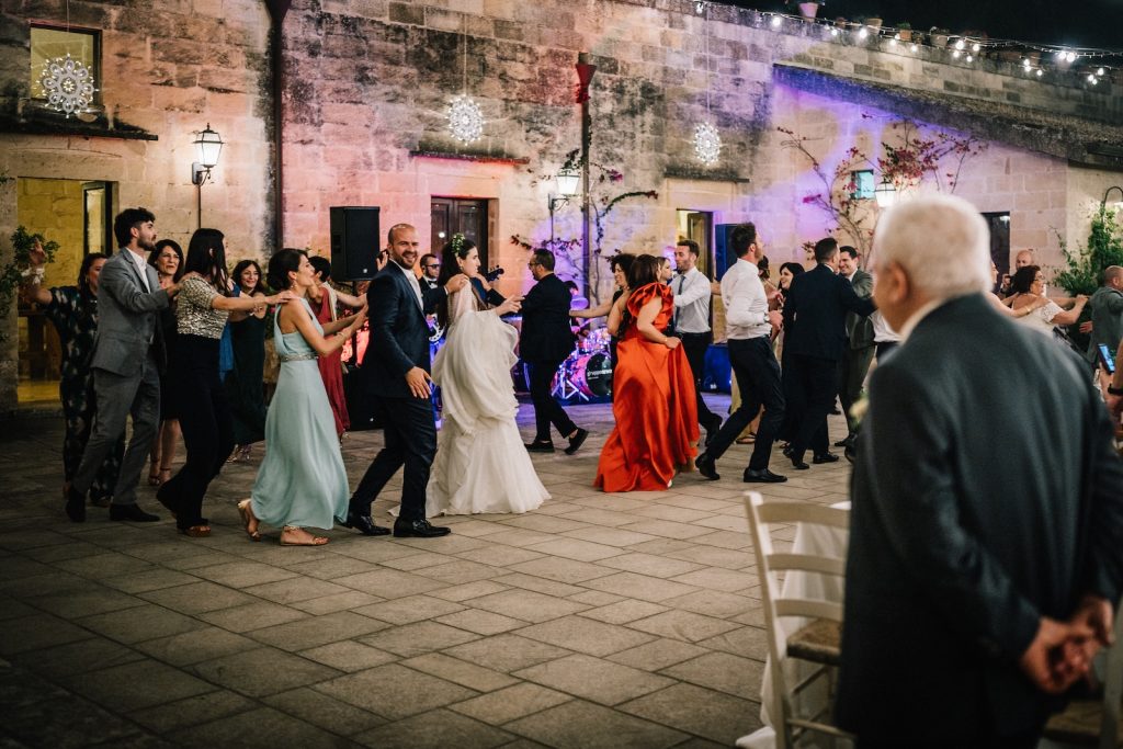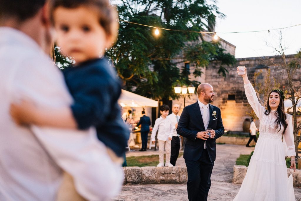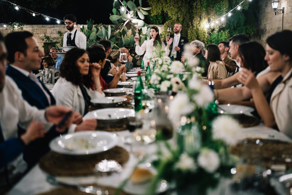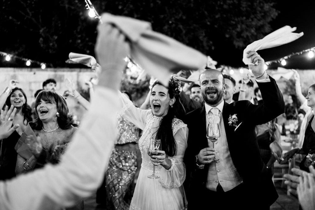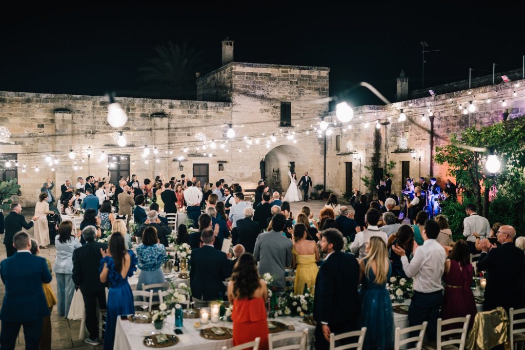 Dopo un aperitivo tra chiacchiere e brindisi, la cena si è trasformata presto in una festa travolgente. Gli sposi non si sono mai fermati un attimo: balli, risate, abbracci e momenti di pura gioia hanno riempito la corte della masseria. E noi, con le nostre macchine fotografiche, ci siamo sentiti esattamente nel posto giusto, al momento giusto.